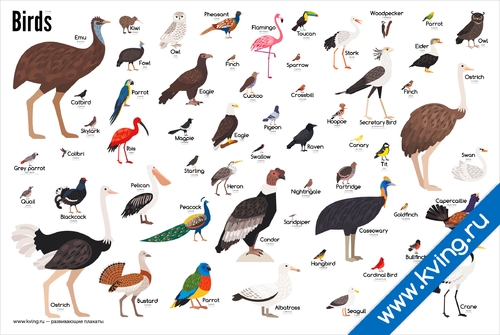 Птицы — плакат по английскому языку, с переводом и транскрипцией