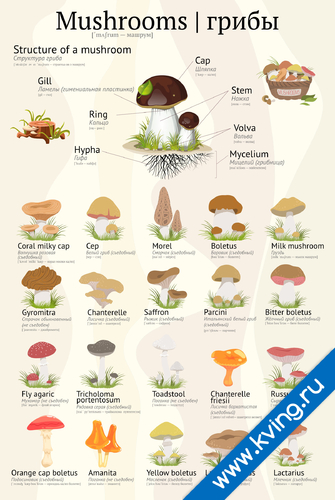 Грибы — плакат на английском языке, с переводом и транскрипцией