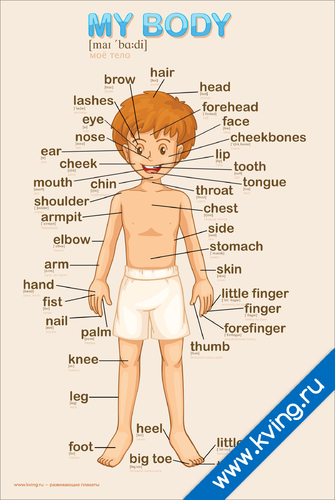 Части тела — плакат по английскому языку, с переводом и транскрипцией