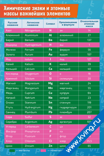 Химические знаки и атомные массы важнейших элементов — плакат по химии