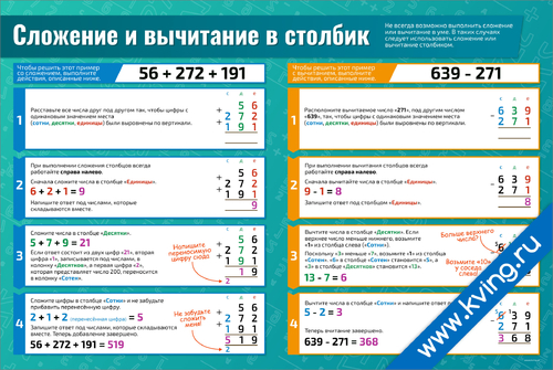 Сложение и вычитание в столбик — плакат по математике, алгебре, геометрии, тригонометрии