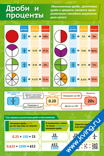 Дроби и проценты — развивающий плакат по алгебре