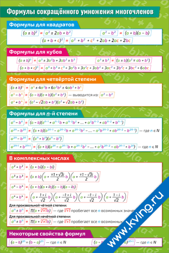 Формулы сокращённого умножения многочленов — плакат по математике, алгебре, геометрии, тригонометрии
