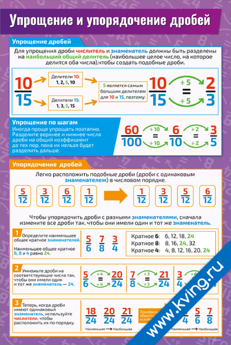 Упрощение и упорядочение дробей — плакат по математике, алгебре, геометрии, тригонометрии