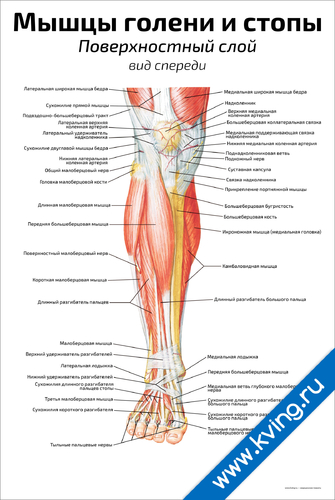 Мышцы голени и стопы, поверхностный слой: вид спереди — медицинский плакат