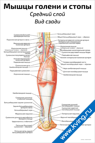 Мышцы голени и стопы: средний слой, вид сзади — медицинский плакат