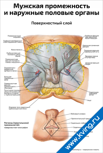 Мужская промежность и наружные половые органы, поверхностный слой — медицинский плакат