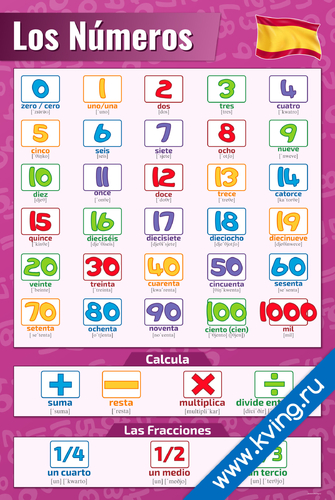 Цифры и числа на испанском — плакат с транскрипцией по испанскому языку